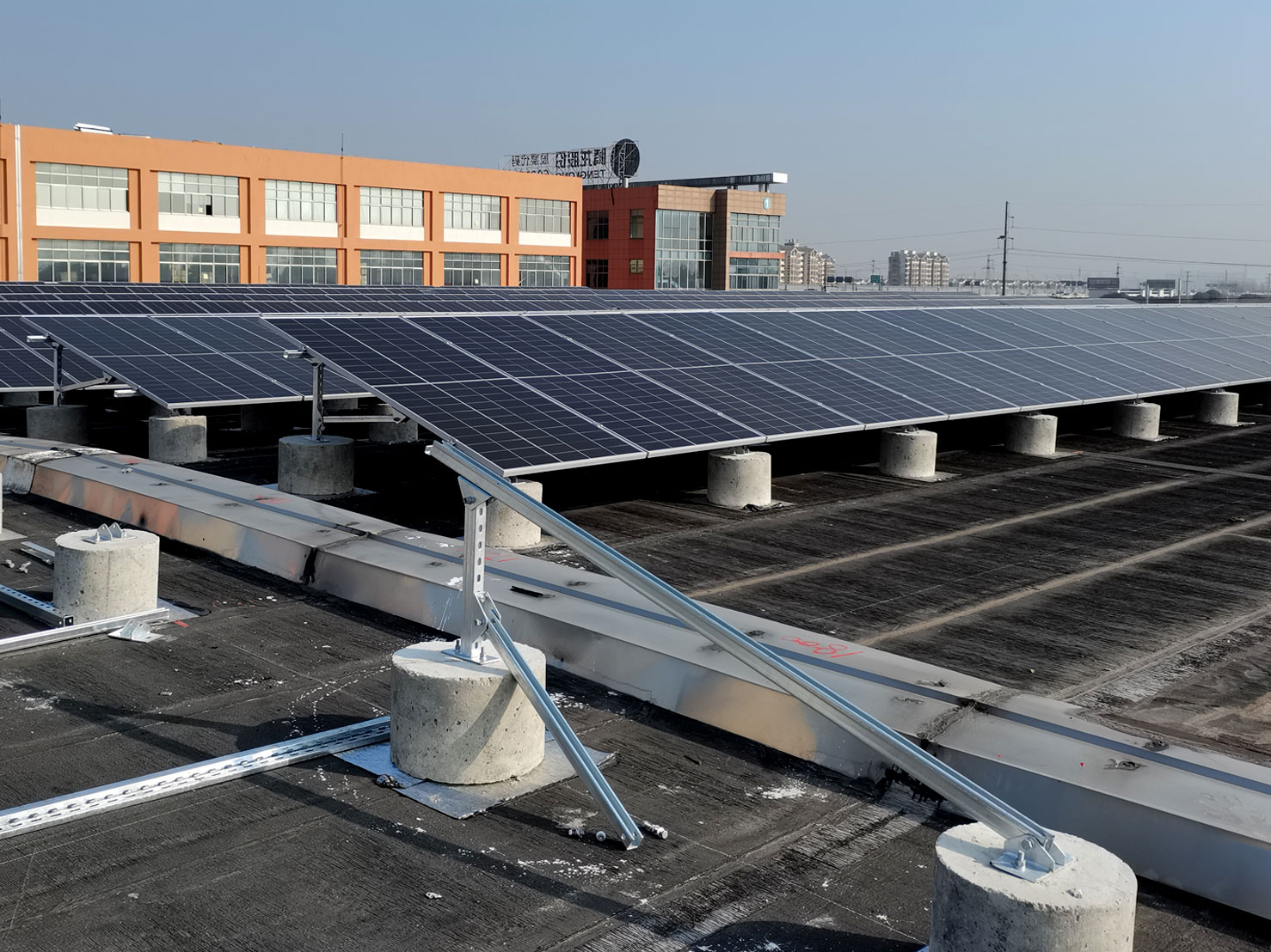 High wind-resistant Solar Mounting System. According to SGS testing, the Integrated Membrane-Rail base has a wind resistance of 4000N.