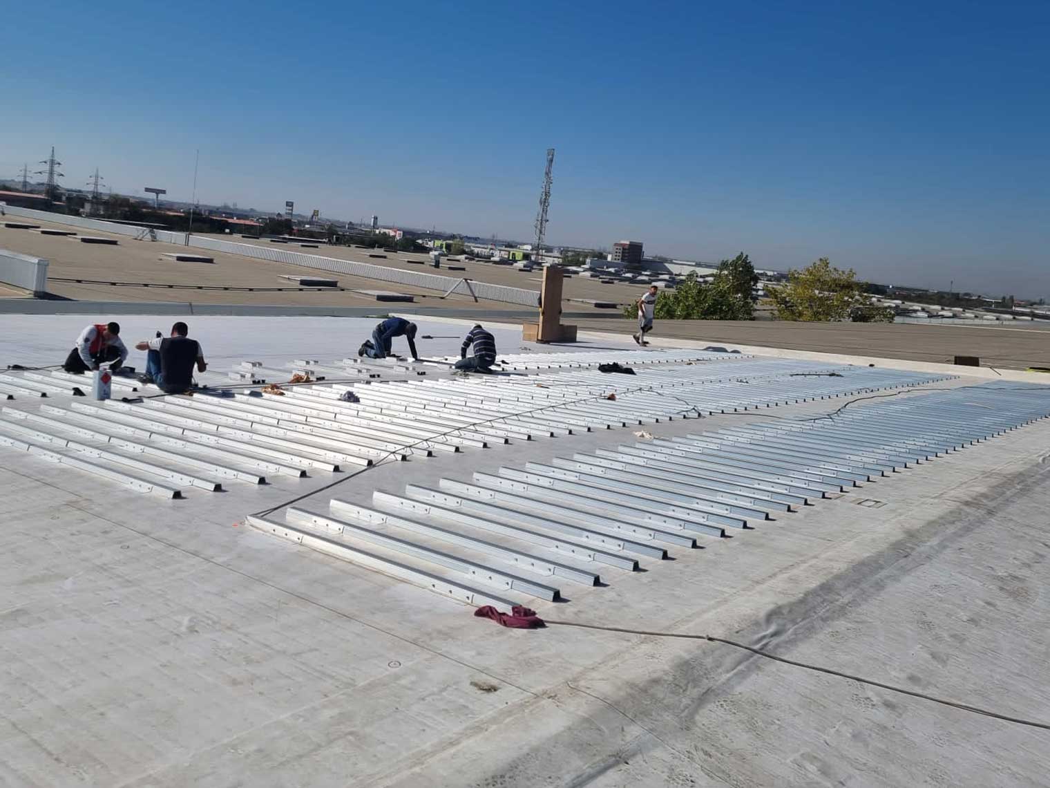 After the integrated Membrane-Rail base is welded onto the roof, the solar panel is directly fastened to the base with clamps.